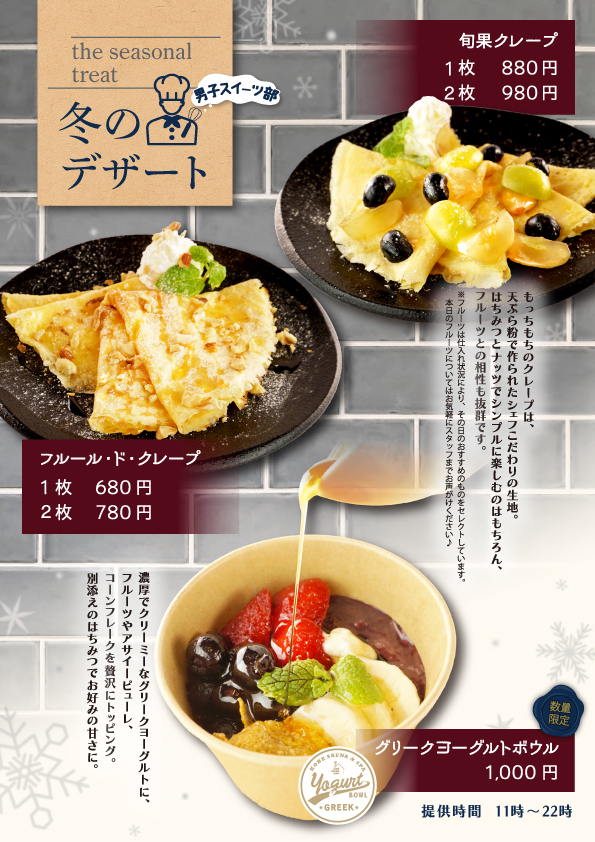 館内レストランで、12/8(月)から冬の期間限定飲食メニューが始まります!