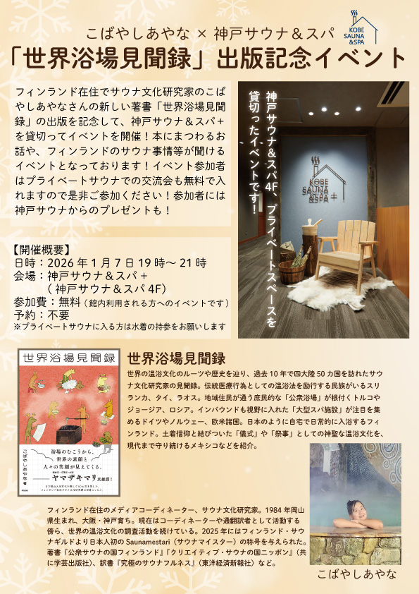 フィンランド在住でサウナ文化研究家のこばやしあやなさんの新しい著書「世界浴場見聞録」の出版を記念して、神戸サウナ&スパ+を貸し切ってイベントを行います!