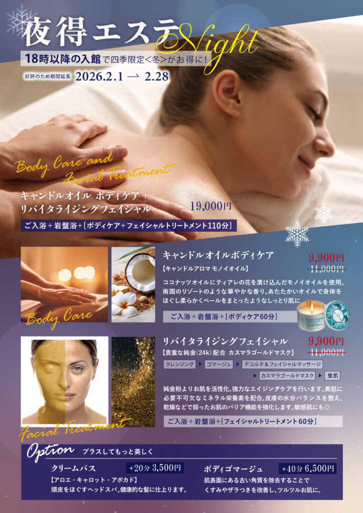 夜18時以降の入館の方限定で、ご入浴フリータイムと岩盤浴が付いたエステ「四季限定 冬(60分)」が、9,900円の特別価格に!