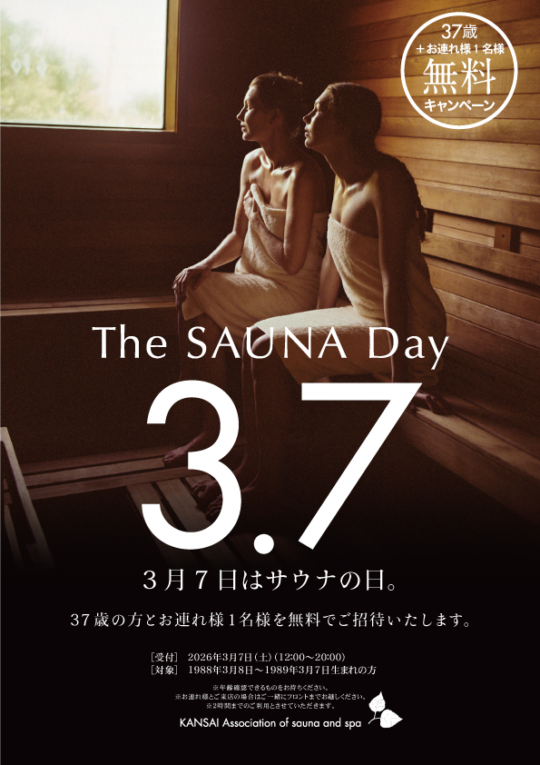 当日限定で、満37歳の方とそのお連れ様1名を、神戸サウナ&スパと神戸レディススパへ無料ご招待いたします。