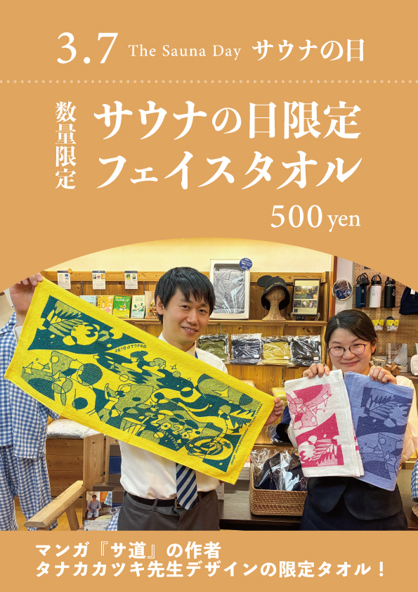 サウナの日当日から数量限定でマンガ『サ道』の作者であるタナカカツキ氏デザインのオリジナルタオルを販売します!