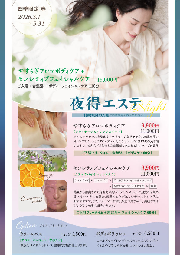 夜18時以降の入館の方限定で、ご入浴フリータイムと岩盤浴が付いたエステ「四季限定 春」が、9,900円の特別価格に!