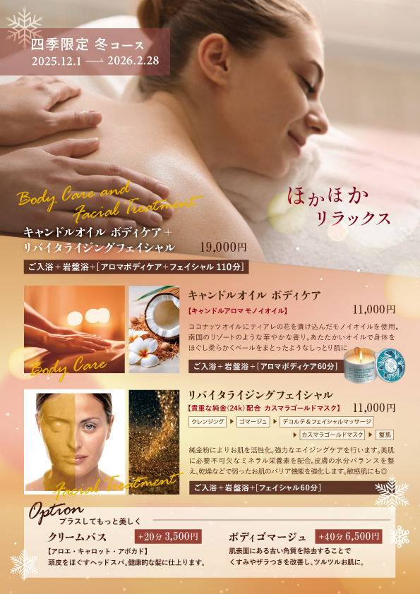 ご宿泊に冬のエステコースがついたプランも人気です