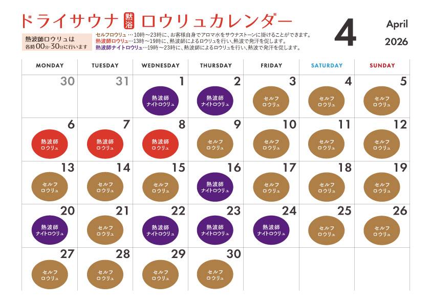 【レディス フロア】4月のドライサウナ ロウリュカレンダーのご案内